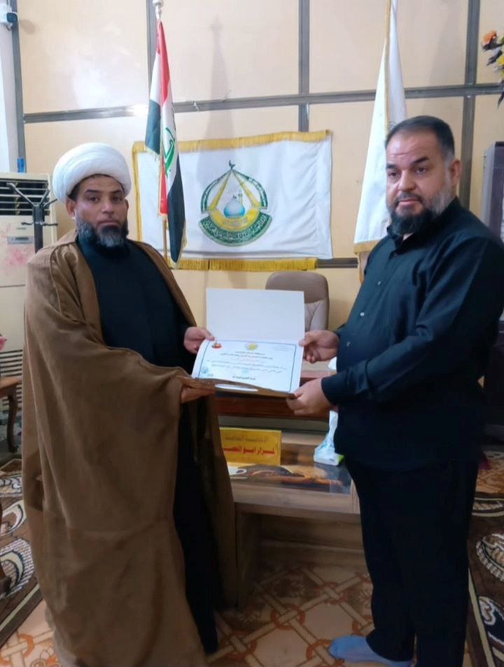 Diwaniyah_ The representative of the Office of His Eminence, Al-Marja' Al-Najafi (may his blessings continue), in Diwaniyah Governorate honored the Special Custodianship of the Shrine of Abi al-Fadhl ibn al-Kadhim (peace be upon them both), in appreciation of their great efforts in serving visitors during the days of the holy month.Sheikh Muhammad Tahmaz Al-Hasnawi said: "Serving the visitors of Ahl al-Bayt (peace be upon them)