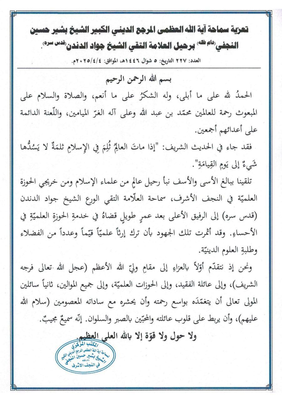 با کمال تأسف و اندوه، خبر درگذشت عالمی از علمای اسلام و فارغ التحصيلان حوزه علميه نجف اشرف، جناب علامه پرهيزگار و متقی شيخ جواد الدندن (قدس سره)، را پس از عمری طولانی كه در خدمت حوزه علميه در احساء گذراند، دریافت کردیم. اين تلاشها به ثمر نشست و ايشان ميراث علمی ارزشمندی و تعدادی از فضلا و طلاب علوم دينی را از خود به يادگار گذاشتند.