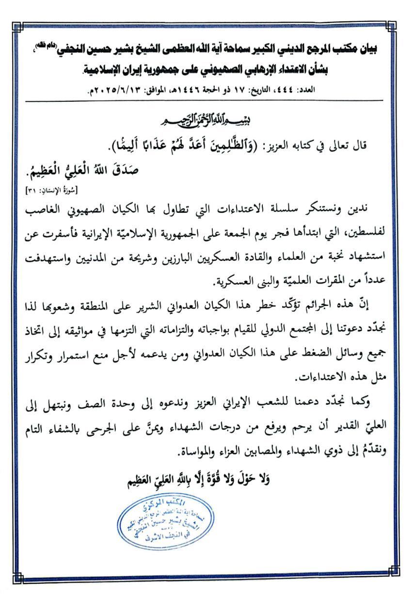 بيانيه دفتر مرجعيت دينی بزرگوار، جناب آيت الله العظمی شيخ بشیر حسين النجفی (دام ظله)، در خصوص تجاوز تروريستی صهيونيستی به جمهوری اسلامی ايران.